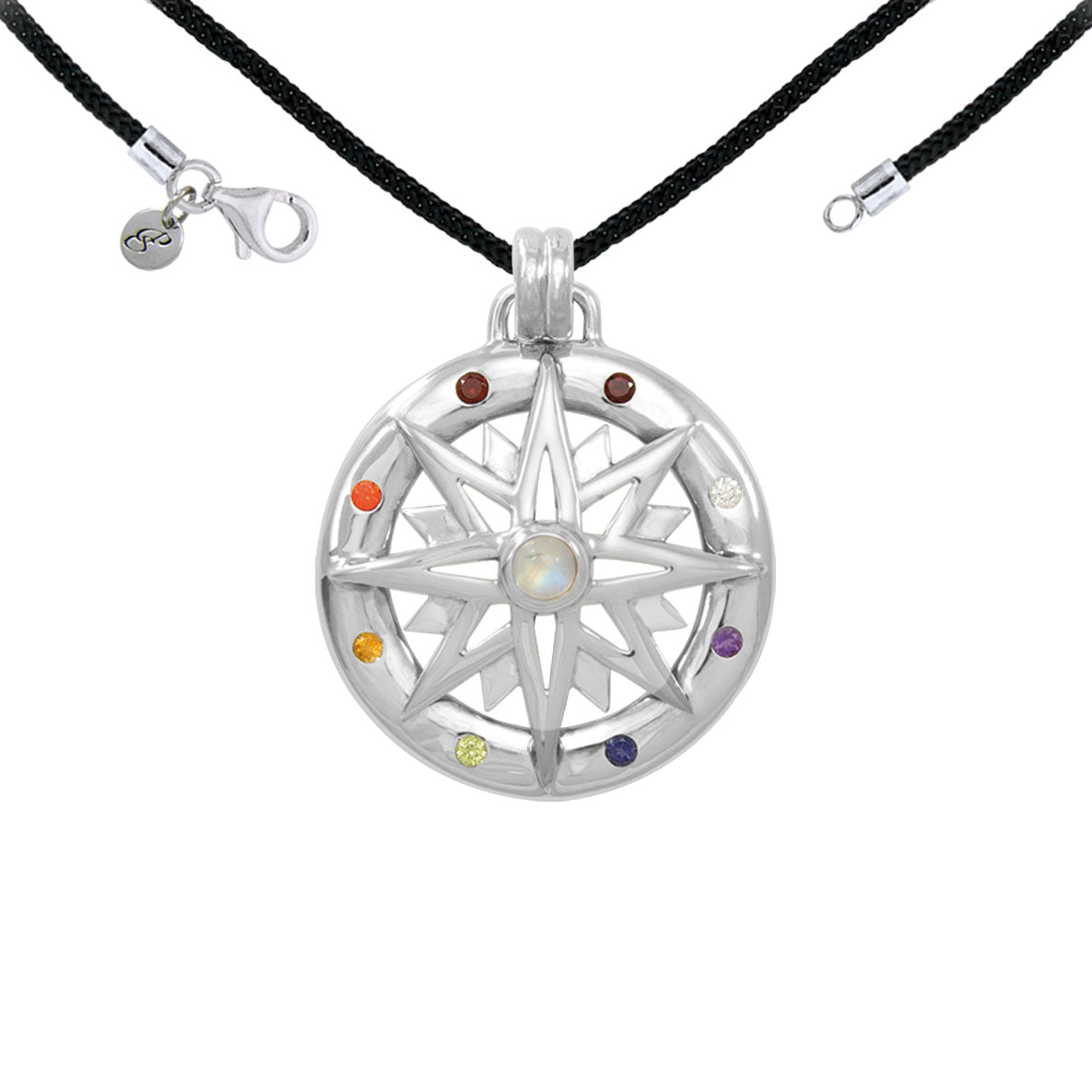 Used for centuries to navigate, the compass is easily the most important tool at sea. Set sail in life with this elegant representation of a classic nautical tool. Paired together with a durable 18" nylon cord (NL002), this Compass Rose Silver Gemstone necklace set is also available as a Sterling Silver pendant (TPD683).