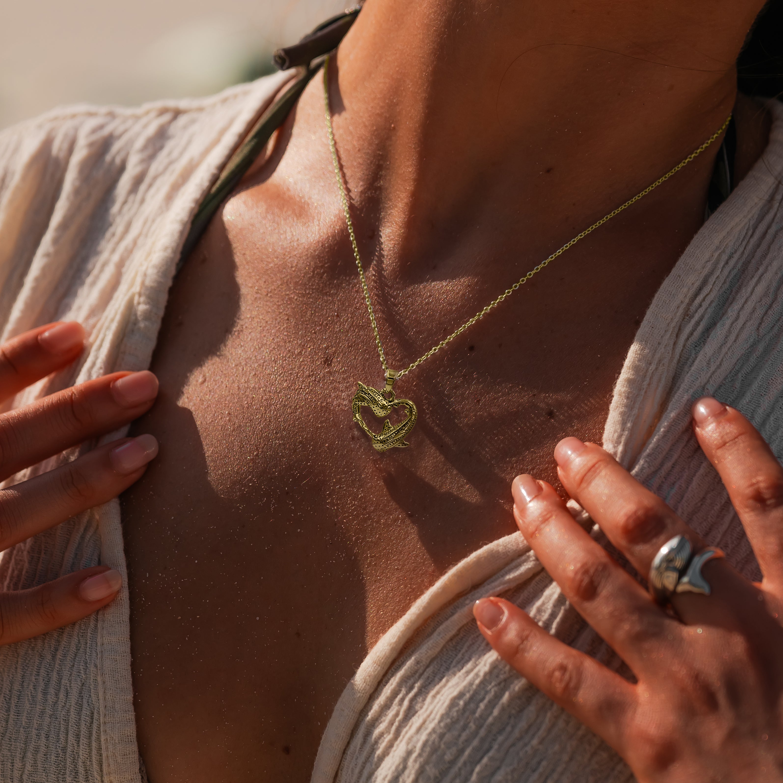 Expertly crafted with Sterling Silver with 14K Vermeil Plate, the DiveSilver Double Whale Shark Heart Pendant symbolizes strength and grace. With intricate details and a one-of-a-kind design, this pendant is a must-have for any ocean lover. Show off your love for the sea and make a statement with this stunning piece of jewelry.