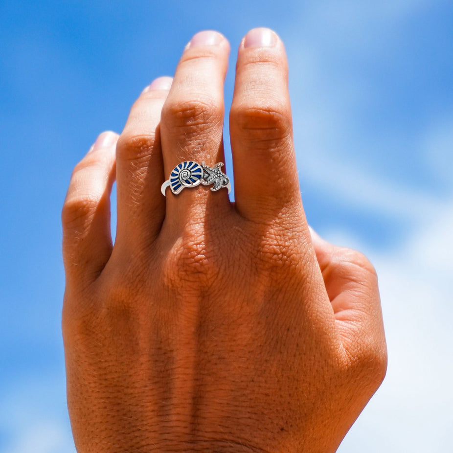 Embrace the beauty of the sea with this exquisite Nautilus Shell and Starfish Sterling Silver Ring. Crafted from luminous sterling silver, the design features two iconic marine elements, symbolizing history and eternal nature. The finely detailed Nautilus shell showcases a mesmerizing spiral, while the charming starfish is often accented with sparkling pavé or textured detailing to catch the light.