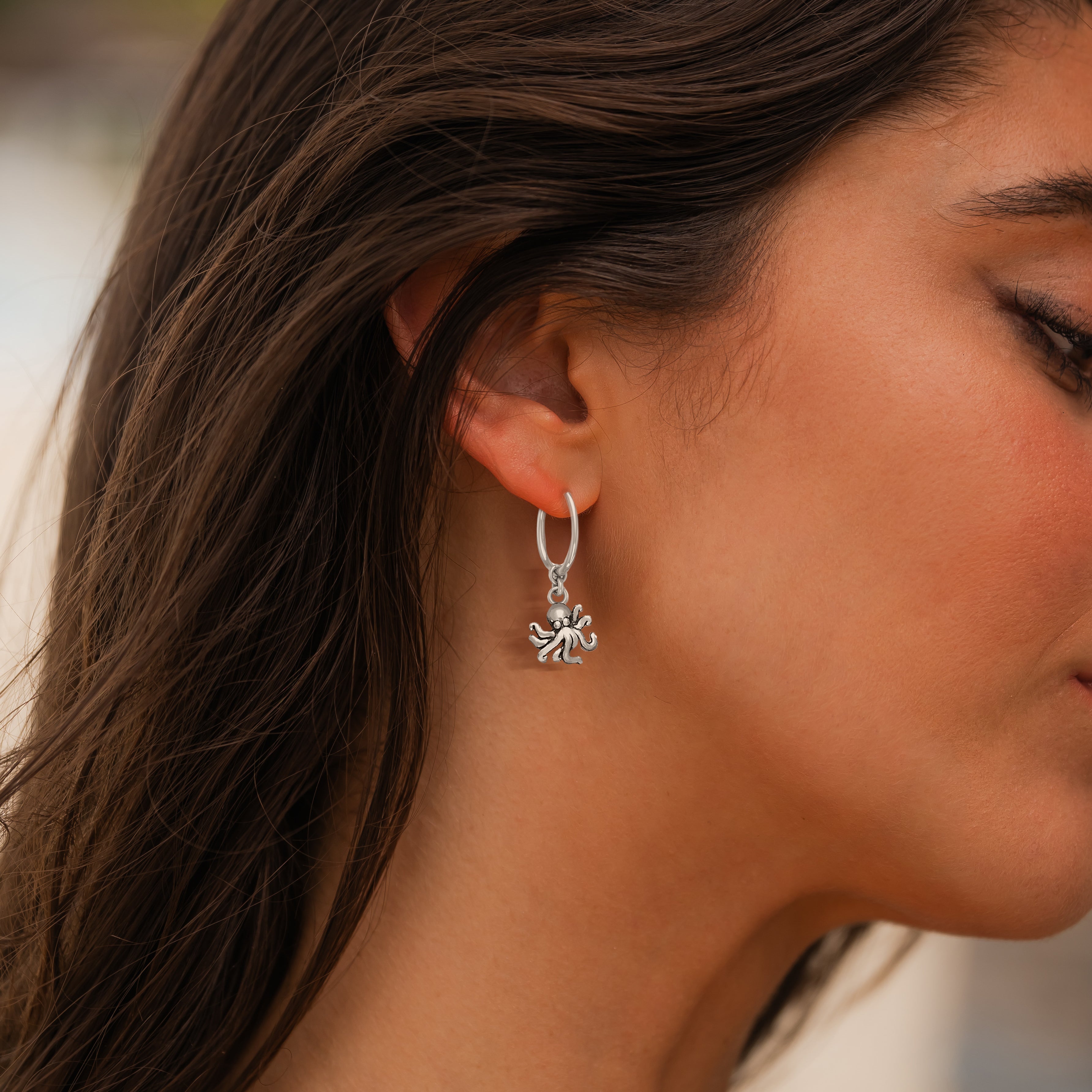 Upgrade your style with our Octopus Sterling Silver Hoop Earrings! Made from high-quality sterling silver, these earrings feature a unique octopus design that is sure to make a statement. With their intricate detailing and durable construction, these earrings are perfect for any occasion. Elevate your look with these elegant and eye-catching earrings today.